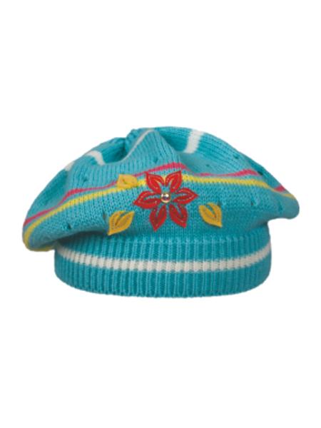 Gyerek sapka-puha kötött franciasapka. A sapka egyszínű csíkokkal és virággal. Anyaga: 100% akril. Mérete: 52-54. Idősebb gyerekek számára is megfelelő.