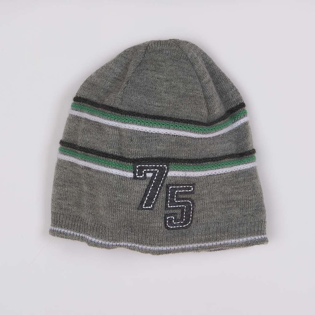 Gyerek sapka. A sapka egyszínű csíkokkal és 75-ös számmal. Anyaga: 100% akril. Mérete: 52-54. Idősebb gyerekek számára is megfelelő.