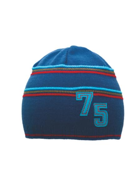 Gyerek sapka. A sapka egyszínű csíkokkal és 75-ös számmal. Anyaga: 100% akril. Mérete: 52-54. Idősebb gyerekek számára is megfelelő.
