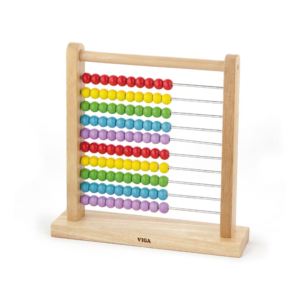 – Fa abakusz színes gyöngyökkel: 10 sorban, mindegyik sorban 10 színes fa golyó (5 szín különböző sorokban: piros, sárga, zöld, kék, lila), amelyek előre-hátra mozgathatók a fémrudakon.