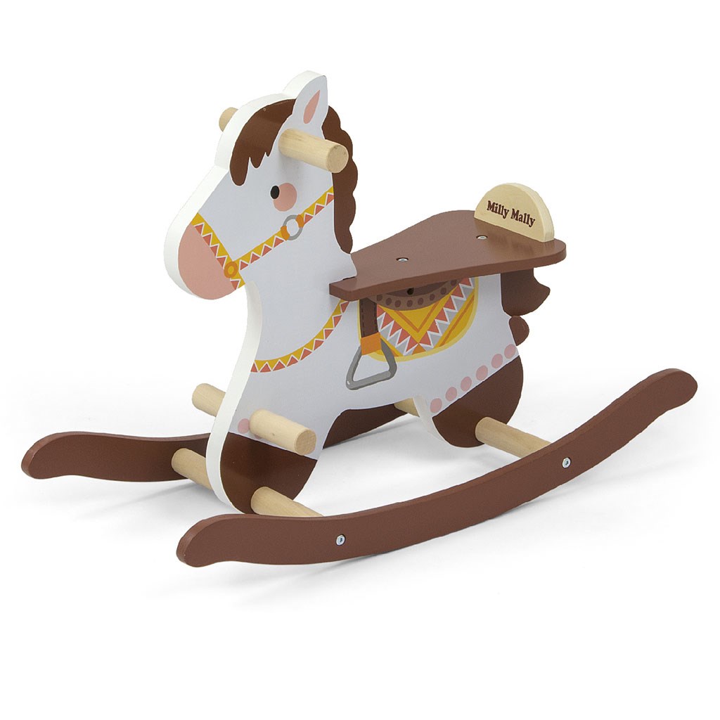 A fából készült hintaló a fejénél fogantyúkkal, a legkisebbek számára pedig egy kiegészítő lábtartóval rendelkezik, amely segít megtartani az egyensúlyt játék közben.